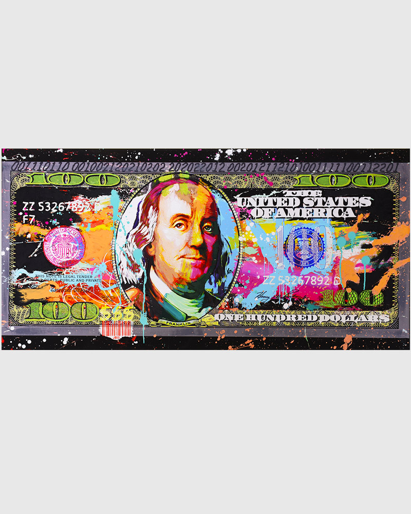 “C-NOTE” 48 by 24 inches, acrylic - mixed media & GD on canvas mounted to hardpanel coated in resin (2020)